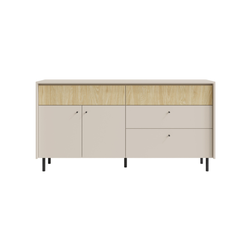 Czarne, wysokie, metalowe nóżki oraz minimalistyczne uchwyty podkreślają nowoczesny styl komody. Kolorystyka łączy piskową beżową barwę z frontami w odcieniu dębu olejowanego, nadając wnętrzu ciepły i przytulny charakter. Produkt dostarczany jest w formie do samodzielnego montażu, z dołączoną instrukcją oraz niezbędnymi akcesoriami montażowymi.