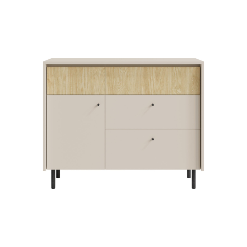 Czarne, wysokie, metalowe nóżki oraz minimalistyczne uchwyty podkreślają nowoczesny styl komody. Kolorystyka łączy piskową beżową barwę z frontami w odcieniu dębu olejowanego, nadając wnętrzu ciepły i przytulny charakter. Produkt dostarczany jest w formie do samodzielnego montażu, z dołączoną instrukcją oraz niezbędnymi akcesoriami montażowymi.