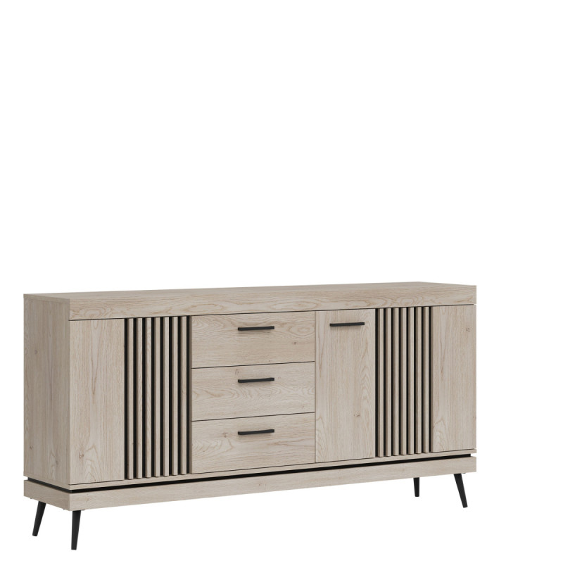 Komoda Mati to elegancka i funkcjonalna propozycja do każdego wnętrza, która łączy w sobie nowoczesny design z praktycznością. Jej korpus i fronty w kolorystyce Dąb Cremona Cotta oraz Czarny tworzą subtelną, a zarazem wyrazistą kombinację, która doskonale wpisuje się we współczesne trendy aranżacyjne.