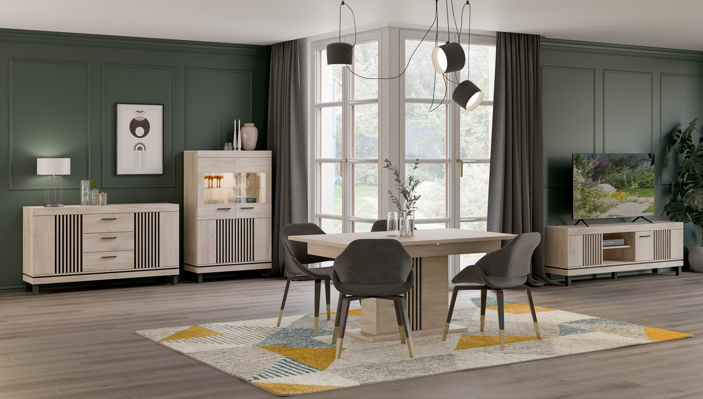 Stół wykonany jest z wysokiej jakości płyty wiórowej laminowanej o grubości 28 mm, w eleganckim kolorze Dąb Cremona Cotta z czarnymi akcentami. Blat i oskrzynia stołu zostały wykonane z płyty wiórowej laminowanej, a kolumna z dodatkowymi lamelami MDF, co zapewnia stabilność i trwałość konstrukcji. Stół wyposażony jest w jedną wkładkę, co ułatwia rozkładanie i dostosowanie stołu do różnych okazji.