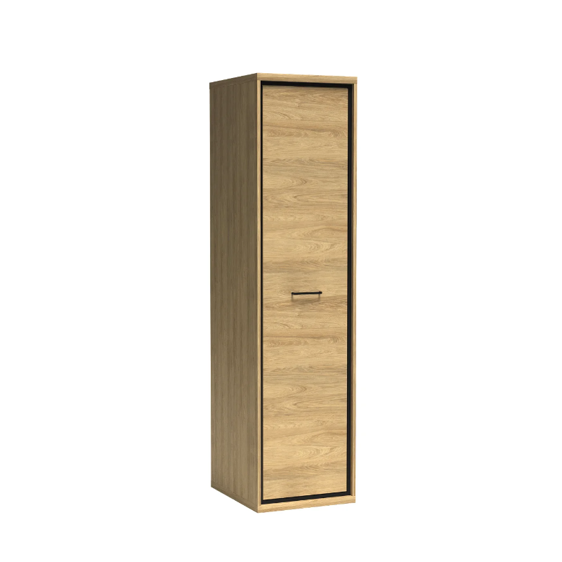 Szafa wykonana jest z laminowanej płyty meblowej, co zapewnia jej trwałość i odporność na uszkodzenia. Obrzeże wykończone okleiną ABS dodaje meblowi estetycznego wyglądu. Tył szafy wykonany jest z płyty HDF, zapewniając stabilność całej konstrukcji.