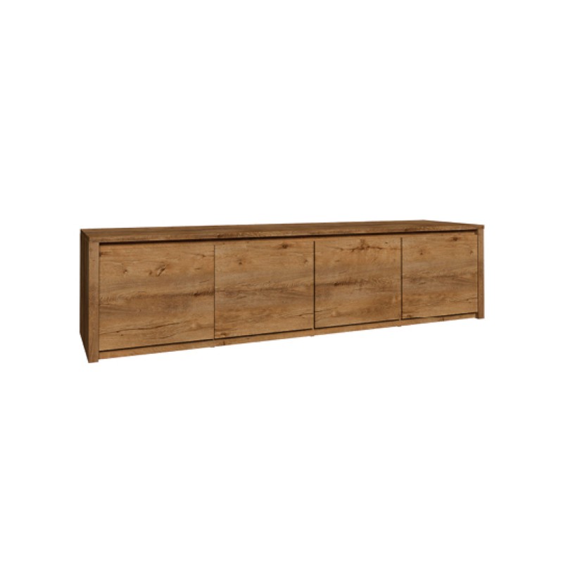 Mebel o wymiarach 170 cm szerokości, 48 cm wysokości i 43 cm głębokości oferuje przestronną przestrzeń do przechowywania. Wyposażona w cztery drzwi z systemem bezuchwytowym, komoda zapewnia elegancki wygląd i wygodę użytkowania. Za drzwiami znajduje się półka, umożliwiająca przechowywanie odzieży, dokumentów czy innych przedmiotów. Dodatkowo, komoda posiada pogrubione korpusy oraz widoczną strukturę drewna, co podkreśla jej nowoczesny design.