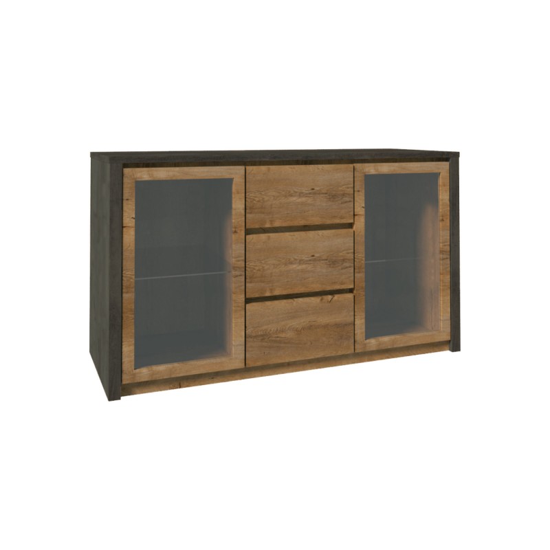 Mebel o wymiarach 140 cm szerokości, 80 cm wysokości i 43 cm głębokości oferuje przestronną przestrzeń do przechowywania. Wyposażona w dwoje drzwi z przeszklonymi frontami oraz trzy pojemne szuflady, komoda zapewnia odpowiednią organizację przestrzeni, umożliwiając przechowywanie odzieży, dokumentów czy innych przedmiotów. Dodatkowo, możliwość dokupienia oświetlenia LED podkreśla estetykę mebla i wprowadza przytulną atmosferę do wnętrza.