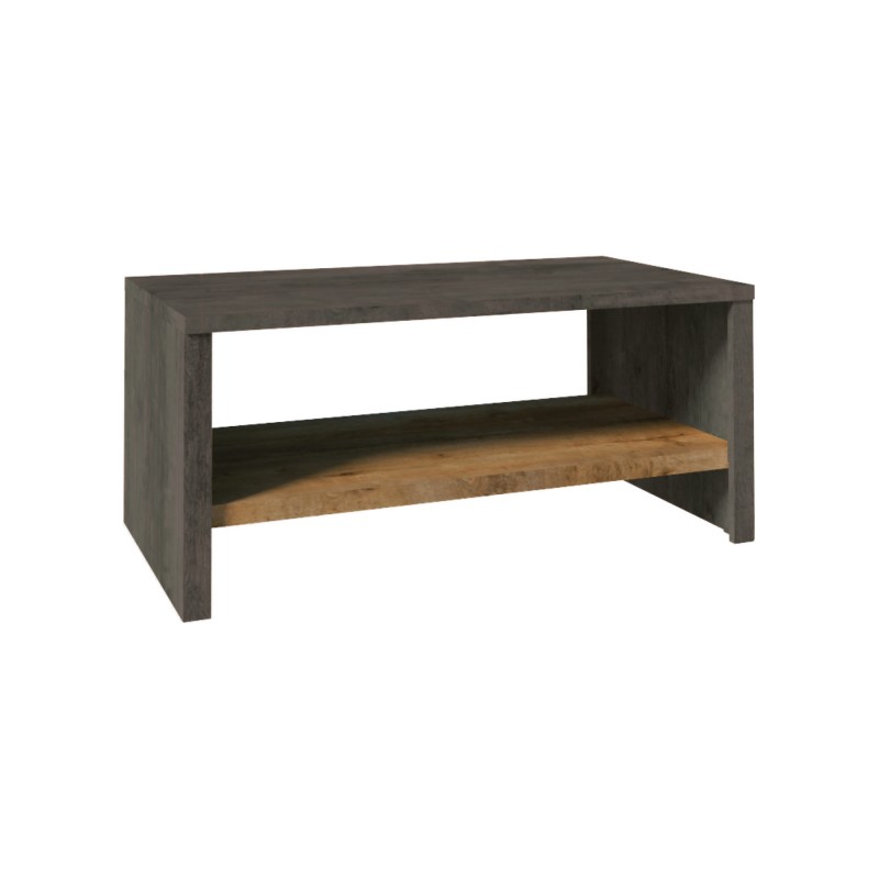 Ława wyposażona jest w praktyczną półkę pod blatem, która umożliwia przechowywanie czasopism, pilotów czy innych drobnych przedmiotów, utrzymując porządek na blacie. Prosta i solidna konstrukcja oraz brak uchwytów podkreślają nowoczesny design mebla.