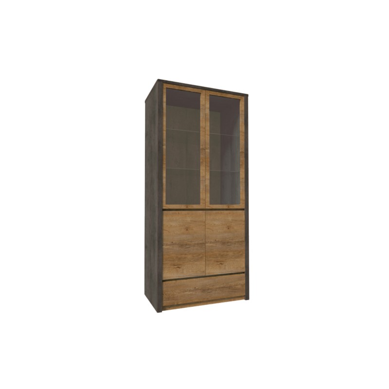 Witryna wyposażona jest w dwie przeszklone szafki w górnej części, idealne do eksponowania dekoracji czy zastawy stołowej. W dolnej części znajdują się zamknięte szafki oraz praktyczna szuflada, które zapewniają dodatkową przestrzeń do przechowywania. System bezuchwytowy podkreśla nowoczesny design mebla, a solidna konstrukcja gwarantuje jego trwałość.