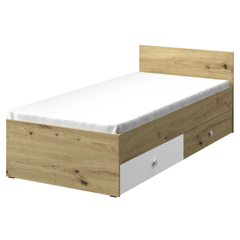 Wykonane z wysokiej jakości płyty meblowej laminowanej o grubości 16 mm, łóżko Nero 14 jest wytrzymałe i odporne na uszkodzenia, a jego obrzeża wykończone są okleiną ABS, co dodatkowo zwiększa trwałość. Fronty łóżka dostępne są w wybarwieniu dąb artisan w połączeniu z białym w wersji matowej lub połyskowej, co pozwala dopasować mebel do indywidualnych preferencji oraz stylu wnętrza.