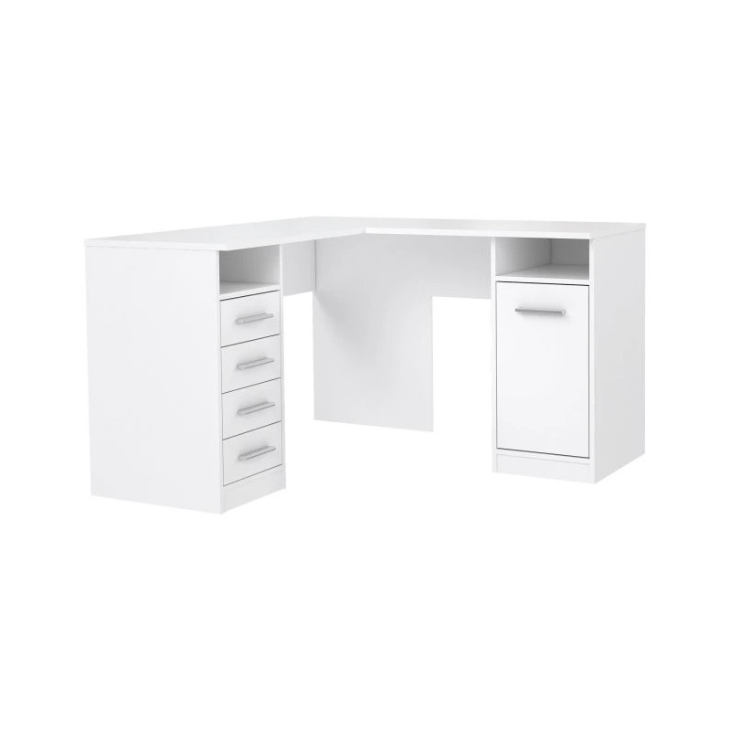Eleganckie biurko narożne w białym dekorze to idealne rozwiązanie do domowego gabinetu lub pokoju młodzieżowego, niezależnie od stylu wnętrza. Jego nowoczesny design i przemyślana konstrukcja sprawiają, że mebel prezentuje się lekko i stylowo, a zarazem oferuje maksymalną funkcjonalność. Pojemne szuflady, praktyczna szafka i otwarte wnęki umożliwiają wygodne przechowywanie dokumentów, przyborów biurowych oraz sprzętów codziennego użytku. Szeroki blat roboczy gwarantuje komfortową przestrzeń do pracy lub nauki, a narożna forma biurka pozwala optymalnie zagospodarować nawet niewielkie pomieszczenia.