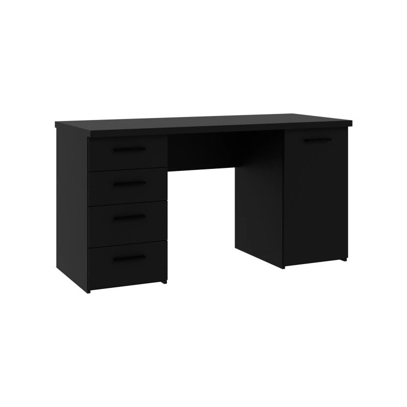 Biurko MT926-Z13M z kolekcji NET106 to idealny wybór dla miłośników nowoczesnych, minimalistycznych i loftowych wnętrz. W całości utrzymane w czarnym dekorze, wyróżnia się ponadczasowym wyglądem i uniwersalnością aranżacyjną. Szeroki blat o długości 145 cm zapewnia wygodną przestrzeń roboczą, idealną do pracy, nauki czy korzystania z komputera. Cztery pojemne szuflady, półka i zamykana szafka pozwalają przechowywać wszystkie potrzebne akcesoria biurowe w uporządkowany sposób. Prosta forma i funkcjonalność sprawiają, że biurko doskonale sprawdzi się zarówno w domowym biurze, jak i w przestrzeni firmowej.