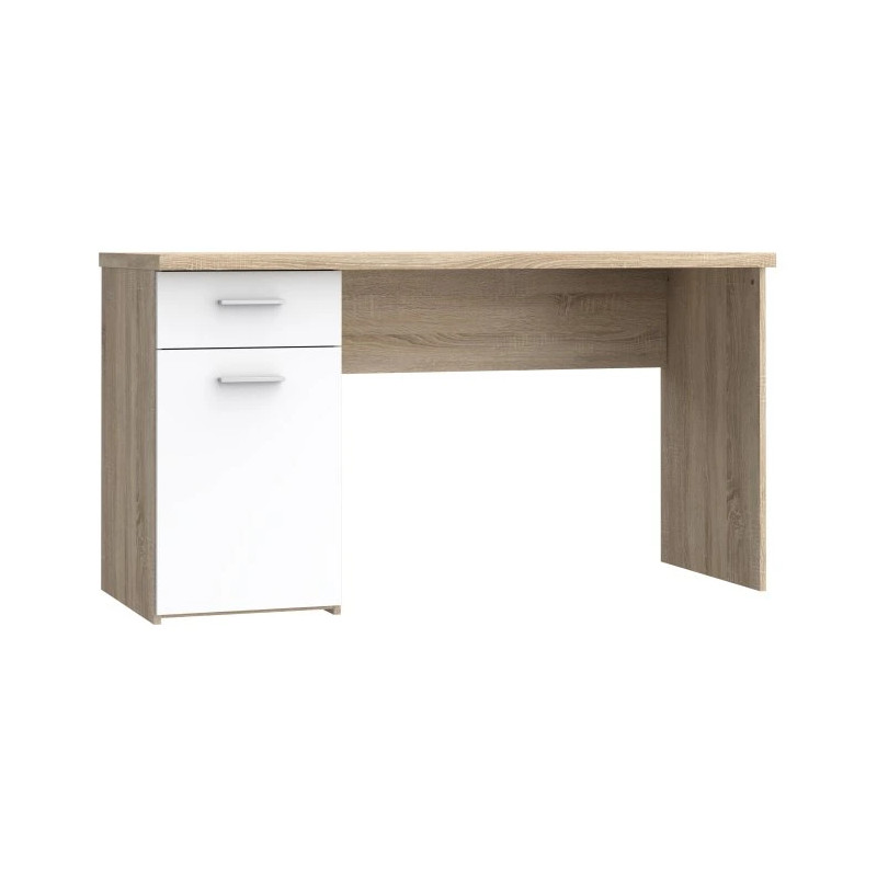 Biurko 140x60 cm Biały/Dąb Sonoma to eleganckie i funkcjonalne rozwiązanie do pokoju młodzieżowego lub domowego biura. Stonowana kolorystyka łącząca matową biel z ciepłym dekorem Dębu Sonoma pasuje do wielu stylów aranżacyjnych — od nowoczesnych po skandynawskie. Szeroki, solidny blat zapewnia dużo miejsca do komfortowej nauki, pracy czy korzystania z laptopa. Pojemna szuflada oraz szafka z dwupoziomową półką umożliwiają wygodne przechowywanie dokumentów, książek i przyborów biurowych. Całość dopełniają proste uchwyty w kolorze aluminium, podkreślające nowoczesny charakter mebla.