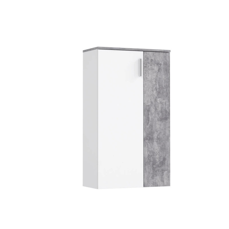 - Korpus i fronty z płyty meblowej, wykończone w dekorze Beton Jasnoszary i Biały