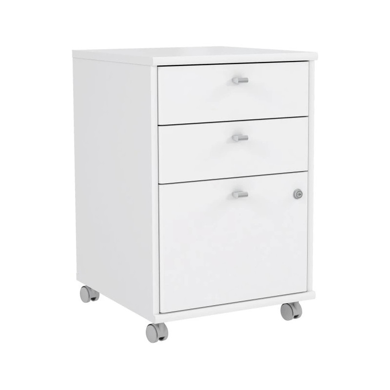 Biały kontener biurowy na kółkach to funkcjonalny i elegancki element wyposażenia każdego gabinetu, biura lub pokoju młodzieżowego. Dzięki dwóm pojemnym szufladom i zamykanej na kluczyk szafce, mebel doskonale sprawdzi się do przechowywania ważnych dokumentów, przyborów biurowych czy akcesoriów codziennego użytku. Subtelny biały dekor rozjaśnia przestrzeń i nadaje wnętrzu świeżości, lekkości i nowoczesnego stylu.