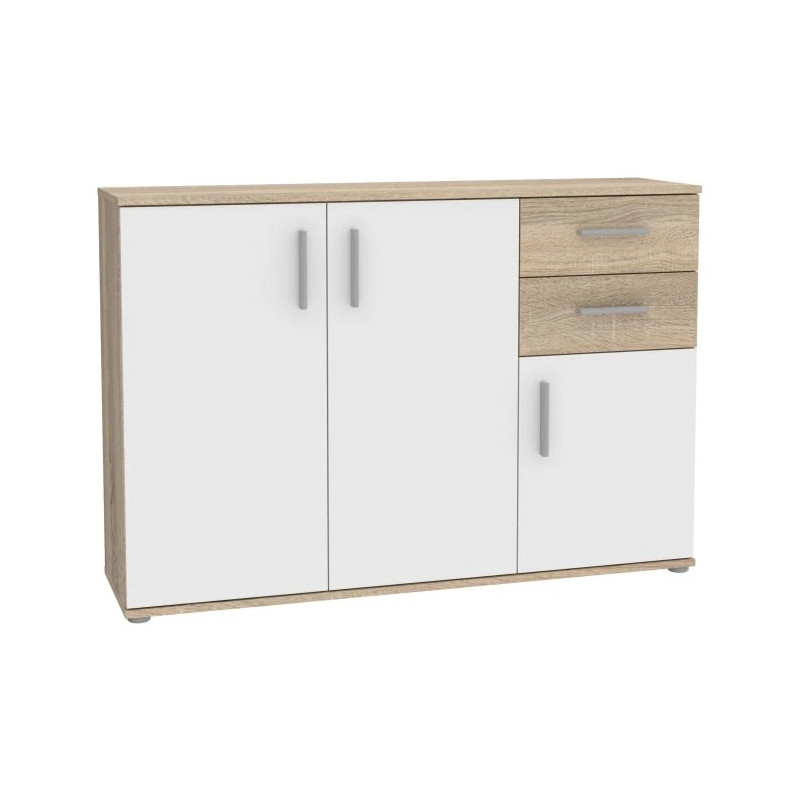 Komoda 120 cm Dąb Sonoma/Biały Uni to funkcjonalny mebel, który doskonale sprawdzi się w wielu wnętrzach – od pokoju dziennego, przez sypialnię, aż po przedpokój. Dzięki 2 pojemnym szufladom oraz 3 zamykanym wnękom z łatwością uporządkujesz odzież, dokumenty, dodatki czy inne domowe przedmioty. Zastosowanie jasnej kolorystyki – dekor Dąb Sonoma z bielą – sprawia, że mebel optycznie powiększa przestrzeń i doskonale komponuje się z różnymi aranżacjami. To mebel łączący styl, funkcjonalność i komfort użytkowania, szczególnie polecany do nowoczesnych i skandynawskich wnętrz.