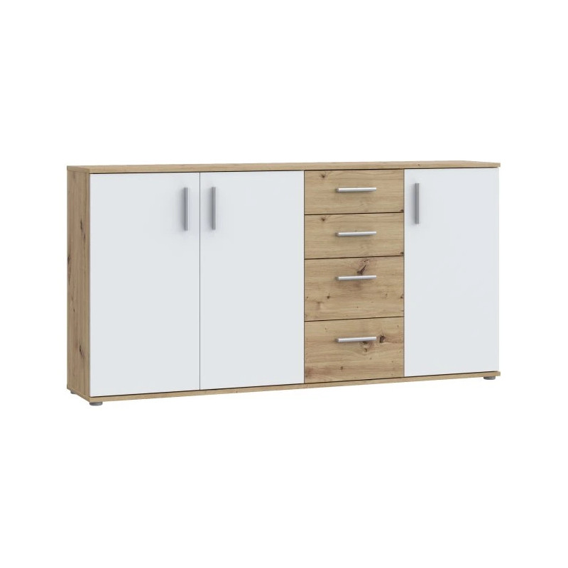 Komoda 160 cm Dąb Artisan/Biały to pojemny, funkcjonalny i stylowy mebel, który doskonale odnajdzie się w różnych pomieszczeniach – od pokoju młodzieżowego, przez sypialnię, aż po przedpokój. Dzięki czterem szufladom oraz trzem drzwiczkom skrywającym półki bez problemu pomieścisz odzież, dokumenty, książki lub domowe akcesoria. Jasna, naturalna kolorystyka – połączenie dekorów Dąb Artisan i Biały – wprowadza do wnętrza przytulność i harmonię, idealnie wpisując się w popularny styl skandynawski. To mebel, który łączy estetykę z praktycznym zastosowaniem, zapewniając komfort codziennego użytkowania.