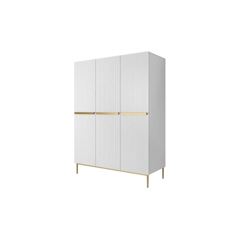Korpus szafy wykonany jest z płyty laminowanej o grubości 16 mm, a fronty z ryflowanej płyty MDF o grubości 18 mm, co zapewnia wytrzymałość i odporność na uszkodzenia. Obrzeża wykończone technologią ABS chronią mebel przed zniszczeniem, a solidne metalowe nóżki dodają całości eleganckiego wyrazu.