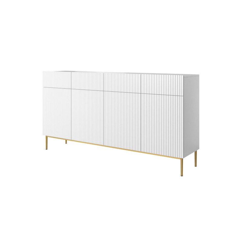 Korpus komody wykonany jest z trwałej płyty laminowanej o grubości 16 mm, natomiast fronty to płyta MDF o grubości 18 mm, wykończone w eleganckim, białym kolorze z ryflowaną powierzchnią, nadającą meblowi nowoczesny charakter.
