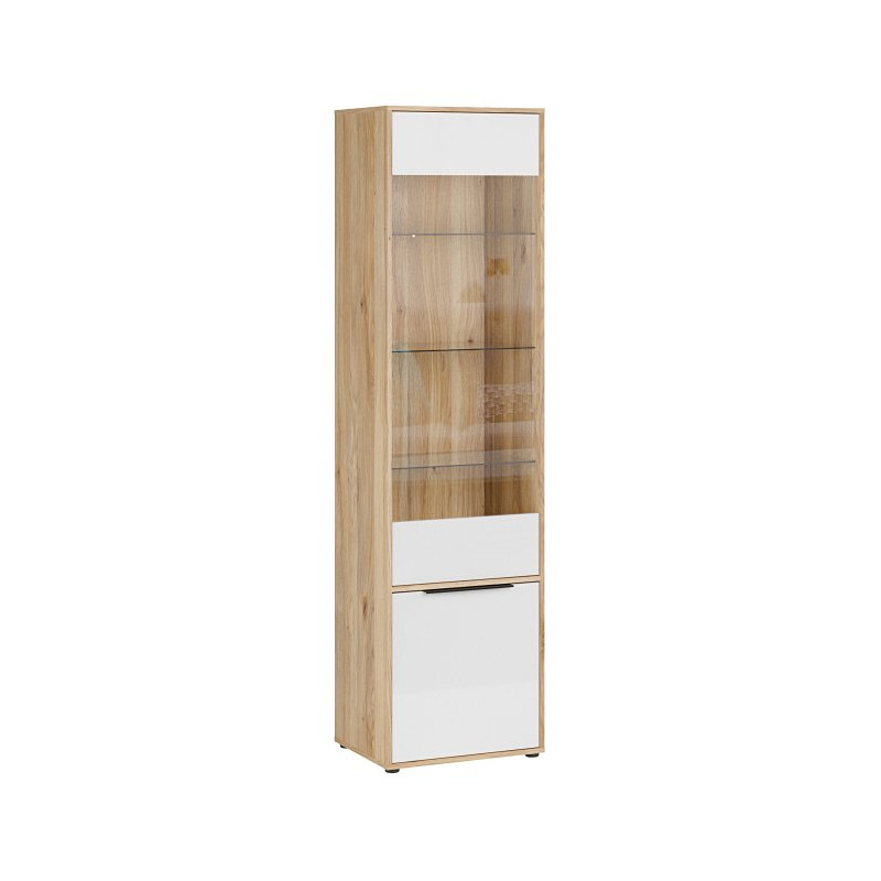 Wąska witryna do salonu jadalni Orkney OKYV711 dąb mauvella/biały połysk