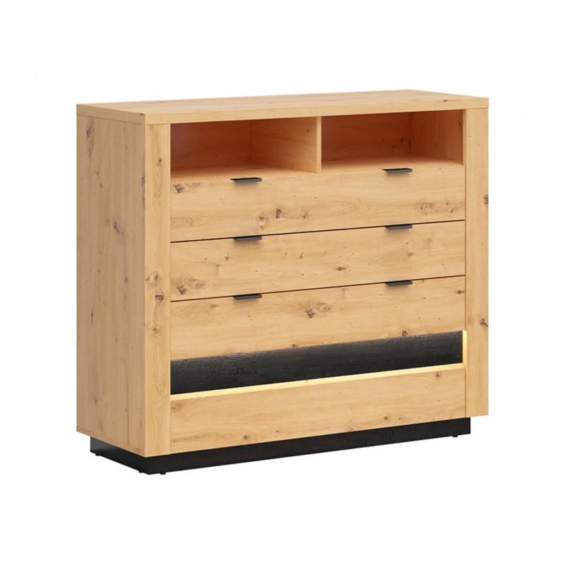 Nie sposób oderwać od niej wzroku! Dlaczego? Komoda z szufladami zachwyca pogrubionymi bokami korpusu i kolorystyką dąb artisan. Przełamaniem jest ozdobna listwa w kolorze spalona deska oraz podkreślające ją oświetlenie LED. Czarna podstawa dodaje charakteru bryle.