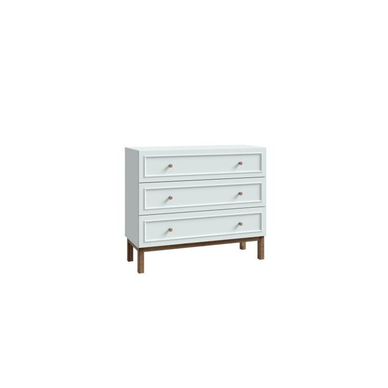 Praktyczne szuflady zapewniają łatwy dostęp do zawartości i ułatwiają organizację. Nowoczesna forma oraz staranne wykonanie sprawiają, że komoda łączy estetykę z trwałością, dopasowując się do różnych aranżacji wnętrz.