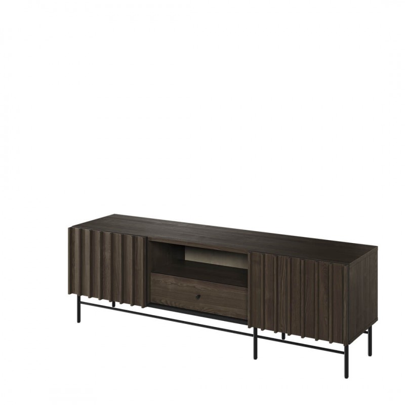 Komoda ta wyróżnia się niezwykle praktycznym i pojemnym układem. Posiada dwie szafki z drzwiczkami oraz wnękę, które umożliwiają wygodne przechowywanie różnego rodzaju sprzętu RTV, takiego jak konsola, płyty, dekoder czy pady. Dodatkowo, praktyczna szuflada pozwala na uporządkowane przechowywanie ulubionych drobiazgów.