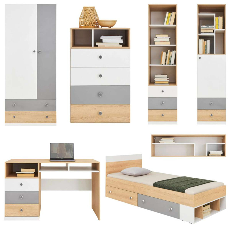 System mebli PIXEL to nowoczesna kolekcja, idealna do aranżacji pokoju młodzieżowego lub dziennego. Połączenie trzech kolorów – naturalnego dębu biszkoptowego, uniwersalnej bieli oraz modnej szarości – tworzy spójną i nowoczesną kompozycję, która przyciąga wzrok i wpisuje się w aktualne trendy wnętrzarskie.