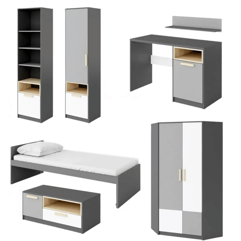 Zestaw mebli młodzieżowych POK 1 – Grafit / Buk Ibsen / Szary Jasny