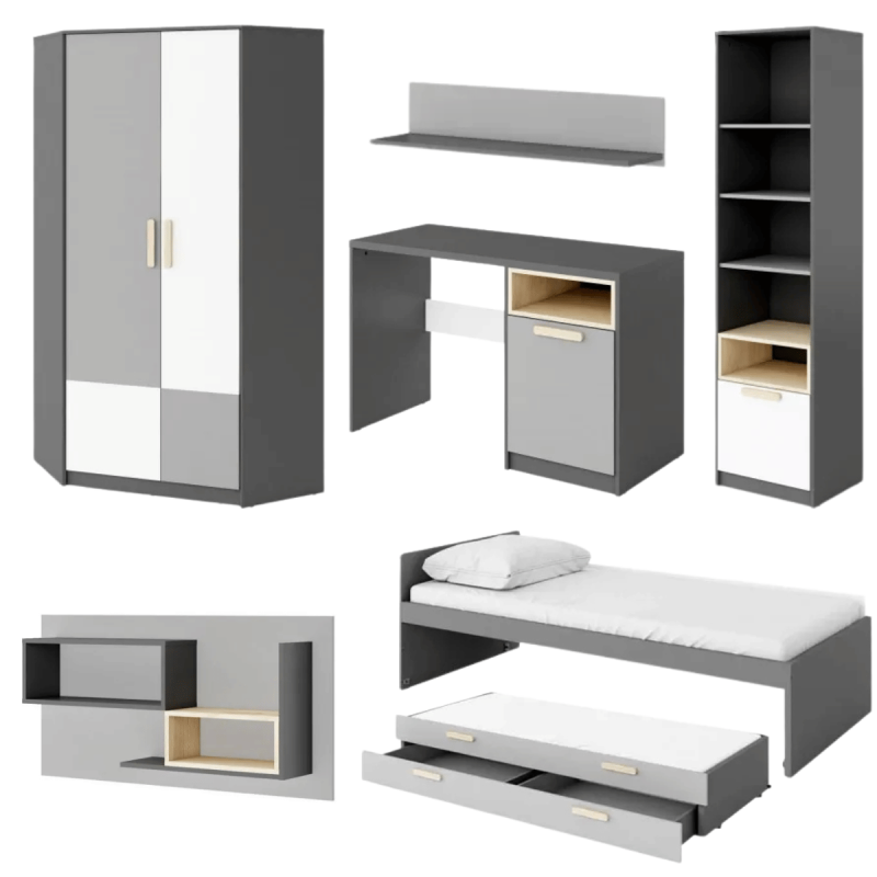 Zestaw mebli młodzieżowych POK 2 – Grafit / Buk Ibsen / Szary Jasny