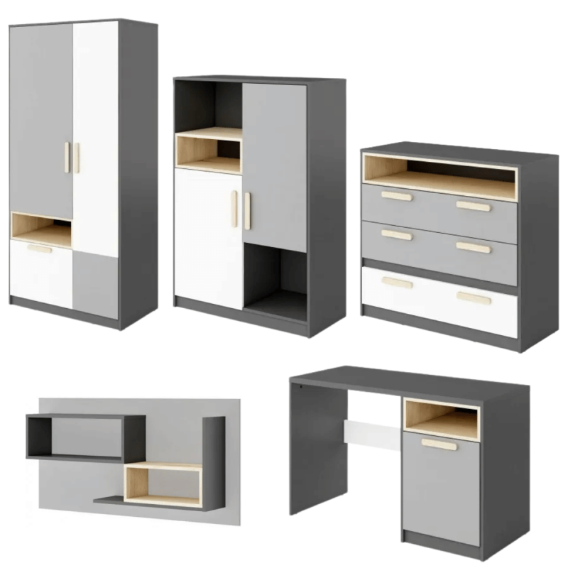Zestaw mebli młodzieżowych POK 3 – Grafit / Buk Ibsen / Szary Jasny