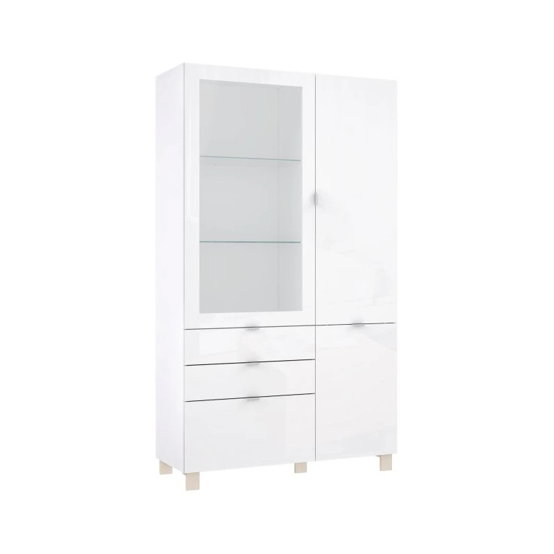 Witryna w dekorze Białym to funkcjonalny i elegancki mebel, który idealnie dopełni aranżację nowoczesnego salonu lub jadalni. Fronty w dekorze szkła Optiwhite odbijają światło, wprowadzając do wnętrza lekkość i subtelny połysk. Przeszklona część witryny umożliwia efektowną ekspozycję zastawy stołowej, szkła czy dekoracji, natomiast 2 szuflady i liczne półki stanowią praktyczne miejsce na przechowywanie przedmiotów codziennego użytku. System cichego domyku podnosi komfort użytkowania, a stalowe uchwyty i nóżki dodają eleganckiego charakteru. Mebel doskonale komponuje się z jasnymi, minimalistycznymi wnętrzami, podkreślając ich styl i funkcjonalność.