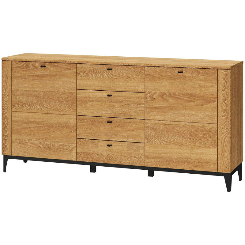 Fronty zrobione są z litego, szczotkowanego drewna dębowego, co nadaje komodzie wyjątkowy charakter. Posiada 4 pojemne szuflady oraz 2 zamykane drzwiczki, za którymi znajdują się 2 półki. Dzięki zastosowaniu bocznych zawiasów z systemem samodomykającym oraz cichego domyku, korzystanie z mebla jest wygodne i ciche.