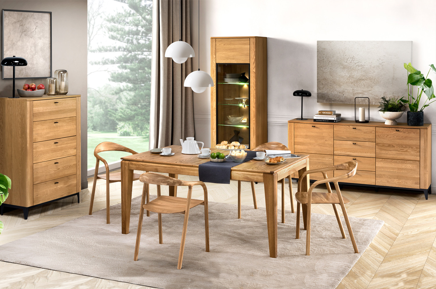 Stół rozkładany Porto to doskonałe połączenie elegancji i funkcjonalności, które idealnie wpisuje się w różnorodne wnętrza. Wykonany z naturalnej okleiny dębowej w kolorze złotego dębu, z subtelnymi czarnymi matowymi akcentami, stół nie tylko zachwyca swoim wyglądem, ale również zapewnia wyjątkową trwałość.