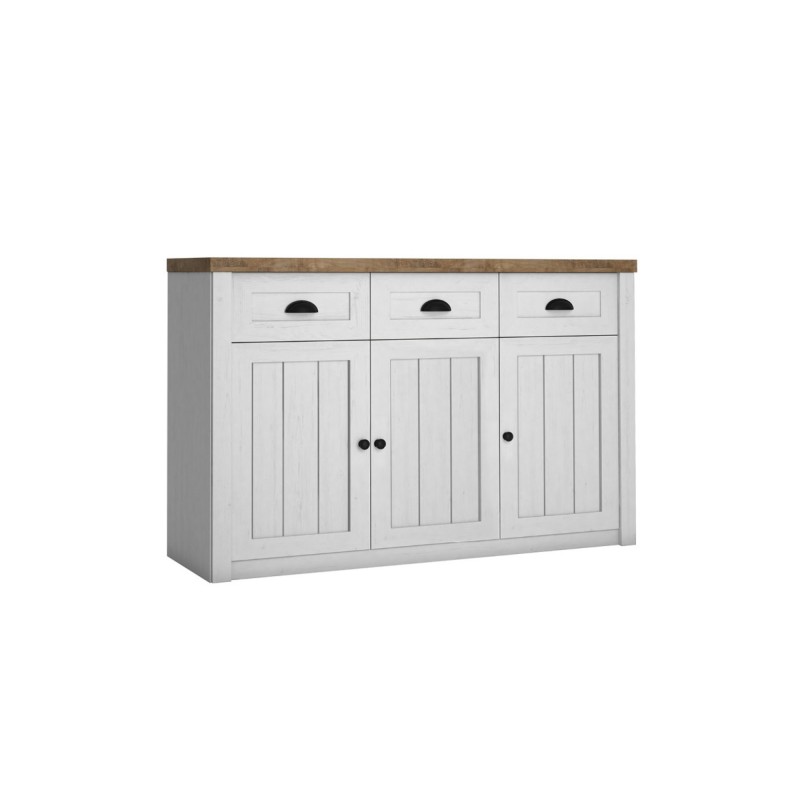 Komoda Prowansja K3SP od Gała Meble to elegancki mebel inspirowany stylem prowansalskim, który łączy funkcjonalność z estetyką. Wykonana z płyty laminowanej odpornej na uszkodzenia, dostępna jest w kilku wariantach kolorystycznych (w osobnych kartach), m.in. Sosna Andersen z akcentami Dębu Lefkas, Green oraz Grey, co pozwala na dopasowanie do różnych aranżacji wnętrz.