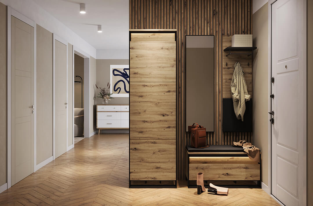 Wieszak ze zbioru QUANT nie tylko doskonale wykorzystuje dostępną przestrzeń, ale także zapewnia wygodne miejsce do przechowywania odzieży i akcesoriów, aby były zawsze na wyciągnięcie ręki.