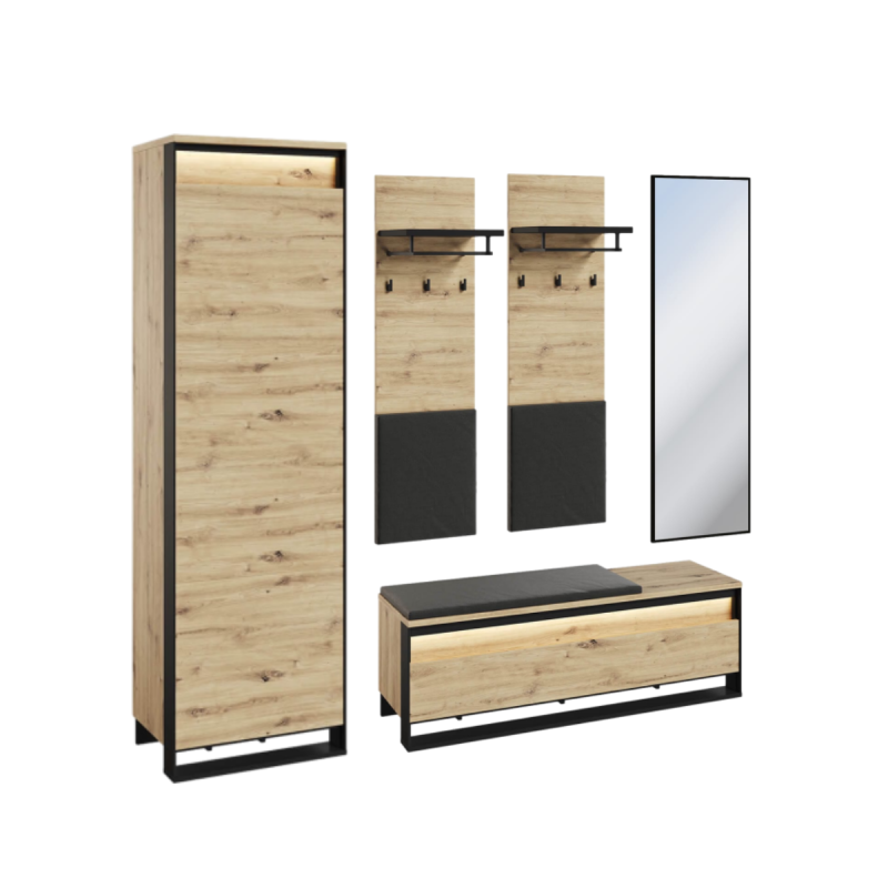 Zestaw QUANT to doskonały wybór dla osób ceniących sobie styl loftowy, funkcjonalność i wysoką jakość wykonania. Idealnie sprawdzi się zarówno w przestronnych, jak i mniejszych przedpokojach, wprowadzając do wnętrza elegancję i porządek.