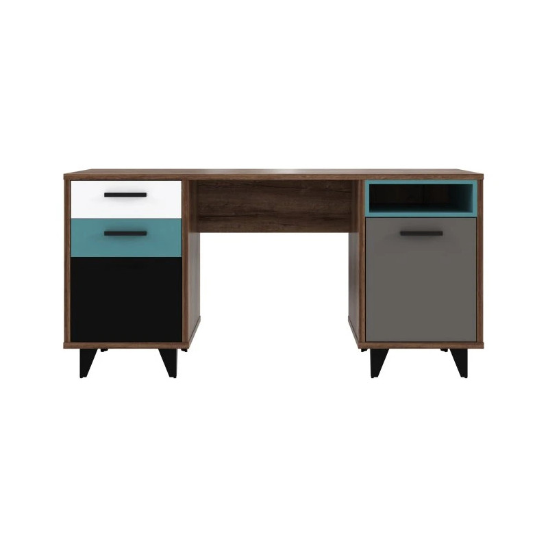 <p>Biurko wyposażono w <strong>dwie pojemne szuflady</strong>, <strong>trzy praktyczne półki</strong> oraz <strong>otwartą wnękę</strong>, która idealnie sprawdzi się do przechowywania książek, folderów czy akcesoriów szkolnych. <strong>Cichy domyk</strong> oraz solidne wykonanie zapewniają komfort codziennego użytkowania. To idealny wybór dla młodych osób, które cenią funkcjonalność i design.</p>