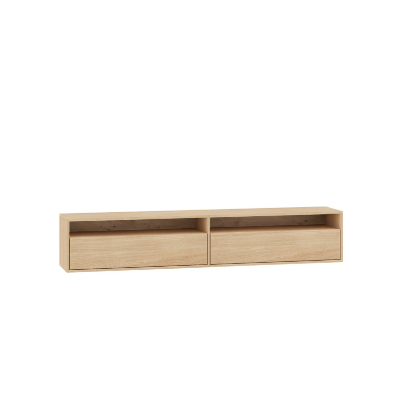 Szafka RTV Reynos 07 to wisząca propozycja do nowoczesnej strefy telewizyjnej. Niska i wydłużona bryła pomaga optycznie odciążyć wnętrze, a montaż na ścianie ułatwia utrzymanie porządku pod meblem i pozwala lepiej dopasować wysokość do własnych potrzeb. To wisząca szafka RTV 180 cm, która oferuje miejsce na sprzęt multimedialny oraz akcesoria potrzebne na co dzień. Dwie otwarte półki ułatwiają szybki dostęp do urządzeń, a zamknięte strefy pomagają zachować estetyczny wygląd całej aranżacji. Dekor dąb Mavelie sprawia, że model dobrze wpisuje się w spokojne, nowoczesne wnętrza.