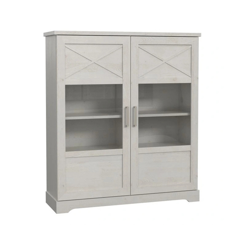 Witryna 130 cm ROCKHAMPTON to elegancki mebel w rustykalnym stylu, który idealnie dopełni aranżację salonu, pokoju dziennego lub jadalni. Dekor Pinia Biała imitujący naturalne drewno wprowadza do wnętrza ciepło i przytulność, a jednocześnie zachowuje uniwersalny charakter, który sprawdzi się zarówno w klasycznych, jak i nowoczesnych przestrzeniach. Pojemne półki oraz przeszklone drzwi umożliwiają estetyczne przechowywanie i efektowną ekspozycję ulubionych dekoracji.