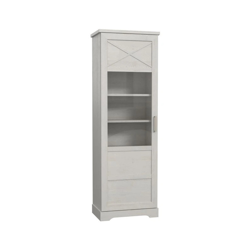 Wąska, wysoka witryna ROCKHAMPTON w dekorze Pinia Biała to mebel zaprojektowany z myślą o stylowych, rustykalnych wnętrzach. Dzięki podziałowi na część przeszkloną i zabudowaną, oferuje jednocześnie możliwość estetycznej ekspozycji dekoracji oraz praktycznego przechowywania przedmiotów codziennego użytku. Jej kompaktowa forma idealnie sprawdzi się zarówno w mniejszych, jak i większych pomieszczeniach — w salonie, jadalni czy pokoju dziennym.