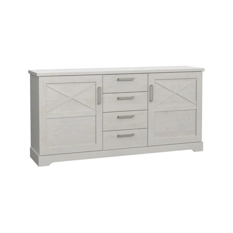 Elegancka komoda ROCKHAMPTON w dekorze Pinia Biała to doskonałe uzupełnienie aranżacji salonu, pokoju dziennego czy jadalni. Delikatna kolorystyka inspirowana naturalnym drewnem nadaje wnętrzu przytulny i harmonijny charakter. Konstrukcja łącząca szuflady i szafki z półkami zapewnia optymalną przestrzeń do przechowywania różnych przedmiotów — od dokumentów i tekstyliów po naczynia czy akcesoria codziennego użytku.