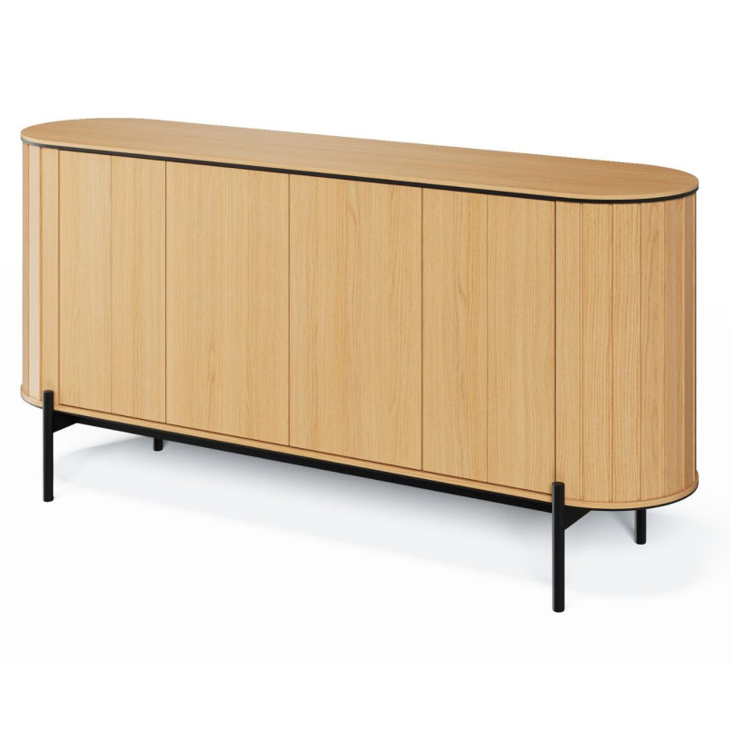 Komoda wyróżnia się unikalnym, półokrągłym kształtem, który dodaje jej nowoczesnego charakteru, jednocześnie wprowadzając miękkie, organiczne linie do wnętrza. Wykonana z wysokiej jakości laminowanej płyty meblowej w kolorze dąb vincenza, emanuje naturalnym ciepłem i elegancją. Czarne metalowe nogi tworzą stylowy kontrast, podkreślając nowoczesny i minimalistyczny wygląd komody.