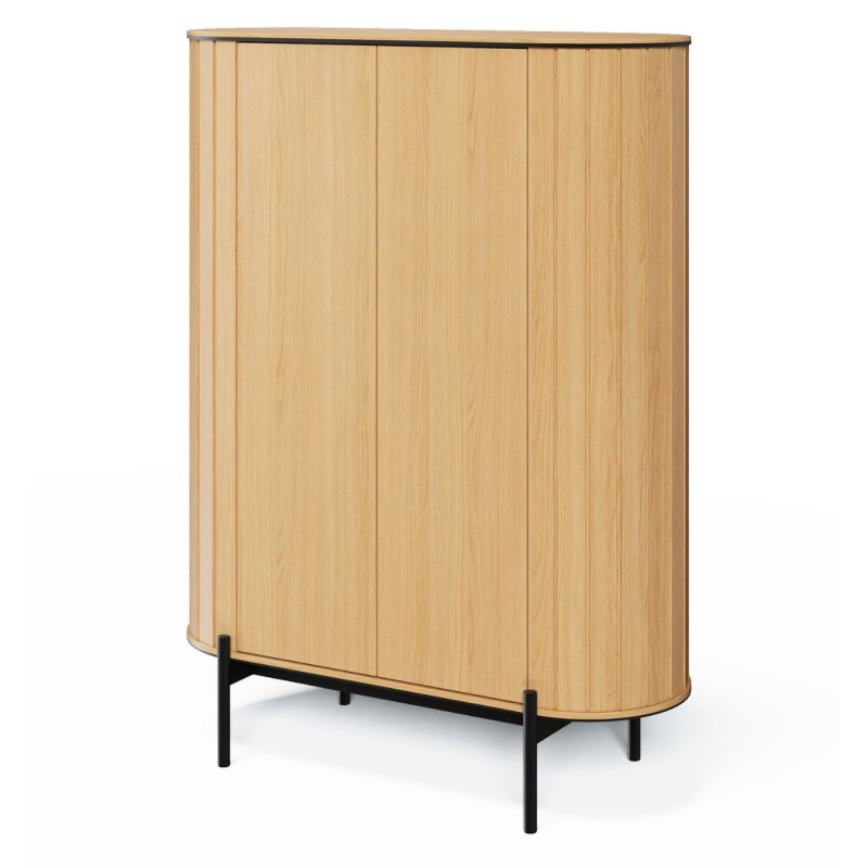 Komoda wyróżnia się unikalnym, półokrągłym kształtem, który dodaje jej nowoczesnego charakteru, jednocześnie wprowadzając miękkie, organiczne linie do wnętrza. Wykonana z wysokiej jakości laminowanej płyty meblowej w kolorze dąb vincenza, emanuje naturalnym ciepłem i elegancją. Czarne metalowe nogi tworzą stylowy kontrast, podkreślając nowoczesny i minimalistyczny wygląd komody.
