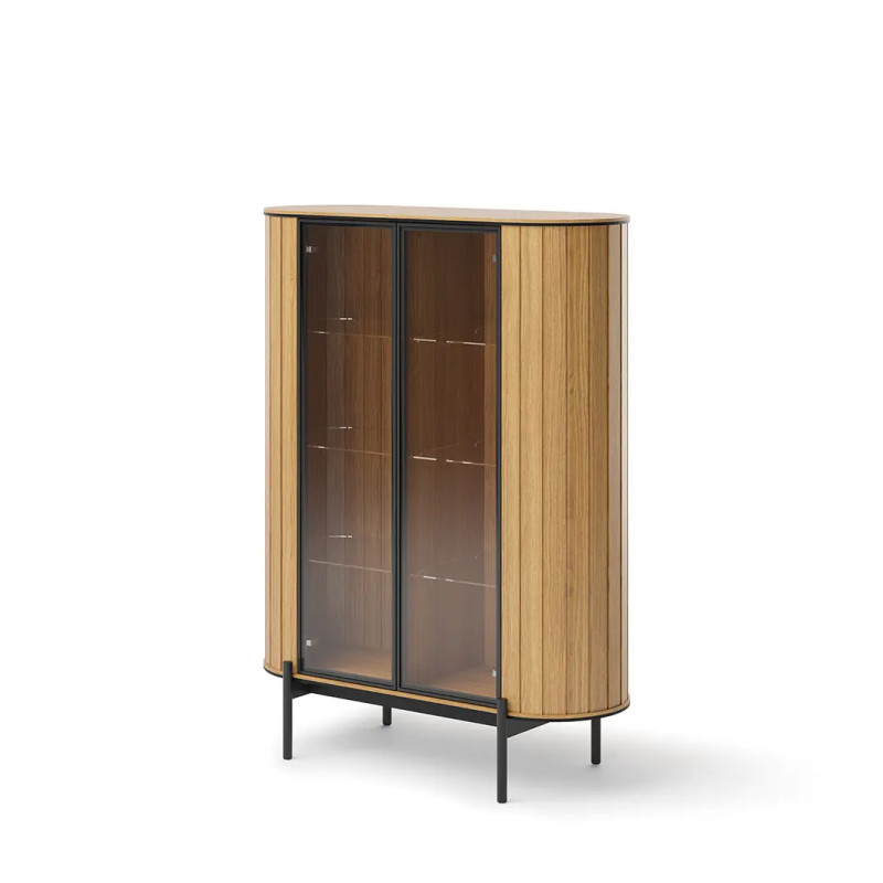 Witryna Rotto wyróżnia się zaokrąglonymi krawędziami i ryflowanymi bokami, które nadają jej unikalny charakter. Przeszklone drzwi pozwalają na efektowne eksponowanie dekoracji, książek czy zastawy stołowej, jednocześnie chroniąc je przed kurzem. System "push to open" umożliwia wygodne otwieranie bez konieczności stosowania tradycyjnych uchwytów, co podkreśla minimalistyczny design mebla.