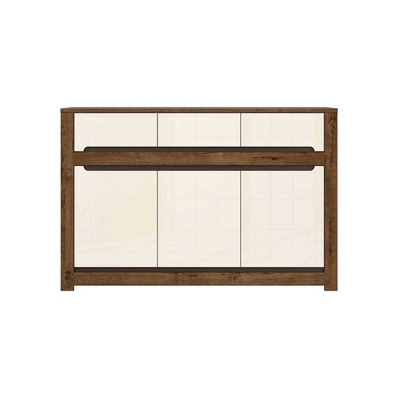 - Jasne fronty w kolorze perłowy wysoki połysk kontrastują z korpusem w głębokim wybarwieniu dąb April. Przebijające usłojenie drzewa i cokoły w kolorze lava podnoszą walory wizualne pojemnej komody.