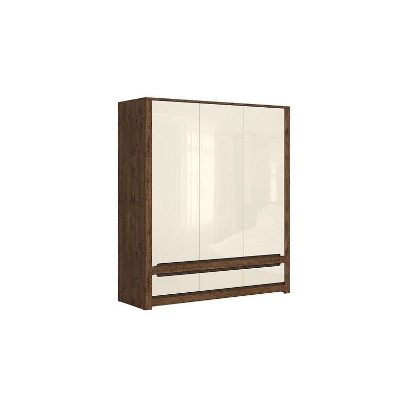 Mebel przyciąga kontrastującą kolorystyką, która łączy korpus w kolorze dąb April z frontem w kolorze perłowy wysoki połysk.