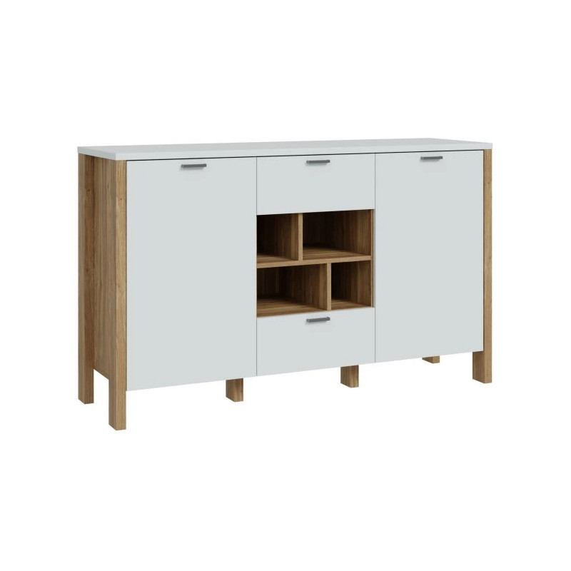 Komoda SAITAMA szeroka 142 cm to funkcjonalny i stylowy mebel, który podkreśli unikatowy charakter Twojego salonu oraz zapewni odpowiednią przestrzeń do przechowywania. Wyposażona w 2 pojemne szuflady i 2 zamykane szafki — daje możliwość uporządkowania codziennych przedmiotów, dokumentów, akcesoriów czy garderoby. Dodatkowo 4 otwarte wnęki oraz szeroki blat tworzą idealne miejsce do efektownej ekspozycji zdjęć, świeczników, ceramiki czy pamiątek z wakacji.