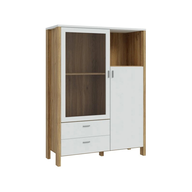 Witryna 110 cm SAITAMA to stylowy i funkcjonalny mebel, który doskonale wyeksponuje książki, dekoracje, pamiątki oraz ceramikę. Dzięki przeszklonym frontom Twoje ulubione przedmioty będą świetnie widoczne i jednocześnie zabezpieczone przed kurzem. 2 szuflady na prowadnicach kulkowych umożliwią wygodne przechowywanie drobnych akcesoriów, dokumentów lub rzeczy codziennego użytku.
