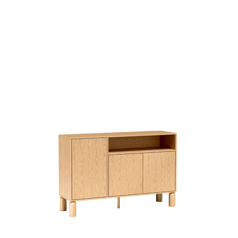 Kolor Dąb Bookmatch nadaje komodzie naturalny, spokojny charakter, a bezuchwytowe fronty z systemem push to open podkreślają nowoczesny, skandynawski styl. Komoda łączy zamkniętą przestrzeń przechowywania z wygodną częścią półkową, dlatego pozwala jednocześnie ukryć mniej reprezentacyjne drobiazgi i wyeksponować dekoracje, książki lub koszyki.