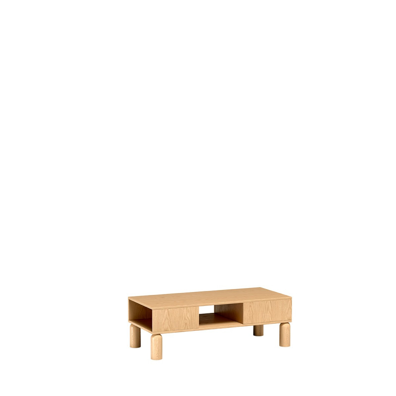 Otwarte wnęki pod blatem umożliwiają wygodne przechowywanie magazynów, pilotów, książek i drobiazgów, które warto mieć zawsze pod ręką. Dzięki temu stolik pomaga utrzymać porządek, jednocześnie zachowując lekką, nowoczesną estetykę.