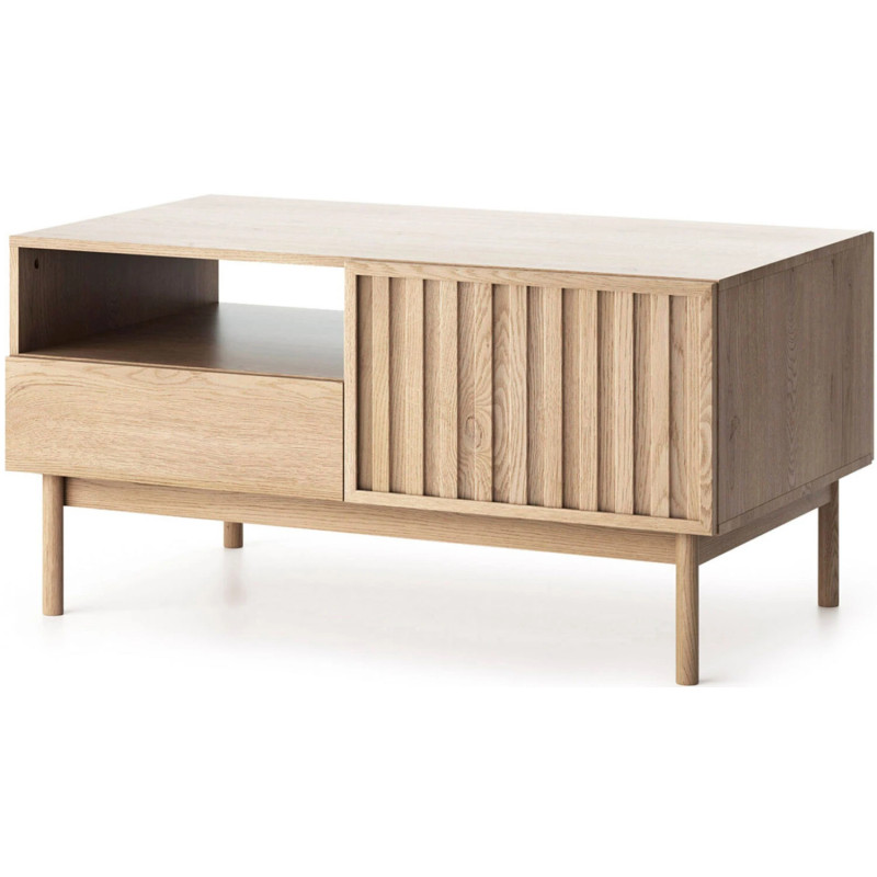 Stolik kawowy Saori ST od Gała Meble to nowoczesny mebel, który łączy elegancki design z wysoką funkcjonalnością. Wykonany w kolorze dębu Cremona z ryflowanymi frontami, wprowadza do wnętrza ciepło i styl. Wysokie, drewniane nóżki nadają mu lekkości, a także ułatwiają utrzymanie czystości pod meblem, umożliwiając swobodny dostęp robotom sprzątającym.