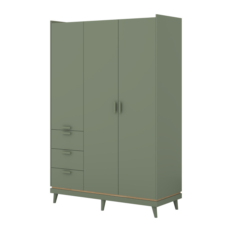 Szafa SCANDI to praktyczny i estetyczny wybór do wnętrz, w których liczy się porządek oraz skandynawska lekkość. Harmonijna bryła, naturalne wykończenie i modne zestawienie kolorów zgaszona zieleń / dąb olejowany wprowadzają do pomieszczenia spokojną, przytulną atmosferę. Dzięki uniwersalnemu charakterowi mebel świetnie sprawdzi się zarówno w sypialni, jak i w pokoju młodzieżowym, pasując do nowoczesnych aranżacji i jasnych, minimalistycznych przestrzeni.