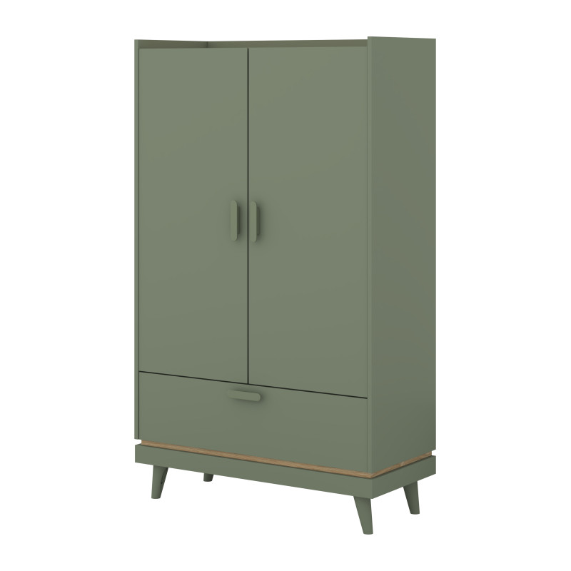 Przemyślany układ przechowywania obejmuje 2 drzwi otwierane, za którymi można przechowywać odzież, tekstylia lub akcesoria, oraz 1 praktyczną szufladę idealną na drobniejsze elementy garderoby. Dzięki temu łatwiej zorganizować przestrzeń i mieć wszystkie potrzebne rzeczy pod ręką. Całość została osadzona na wysokich nóżkach 12 cm, które nadają meblowi lekkości i ułatwiają utrzymanie czystości pod szafką.